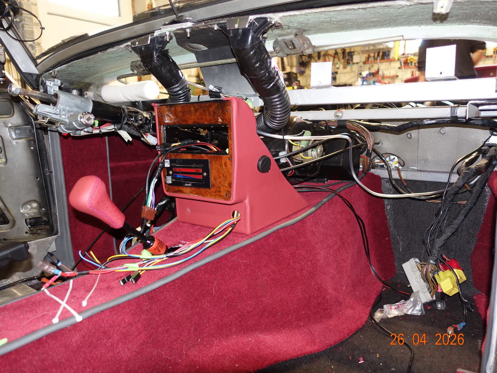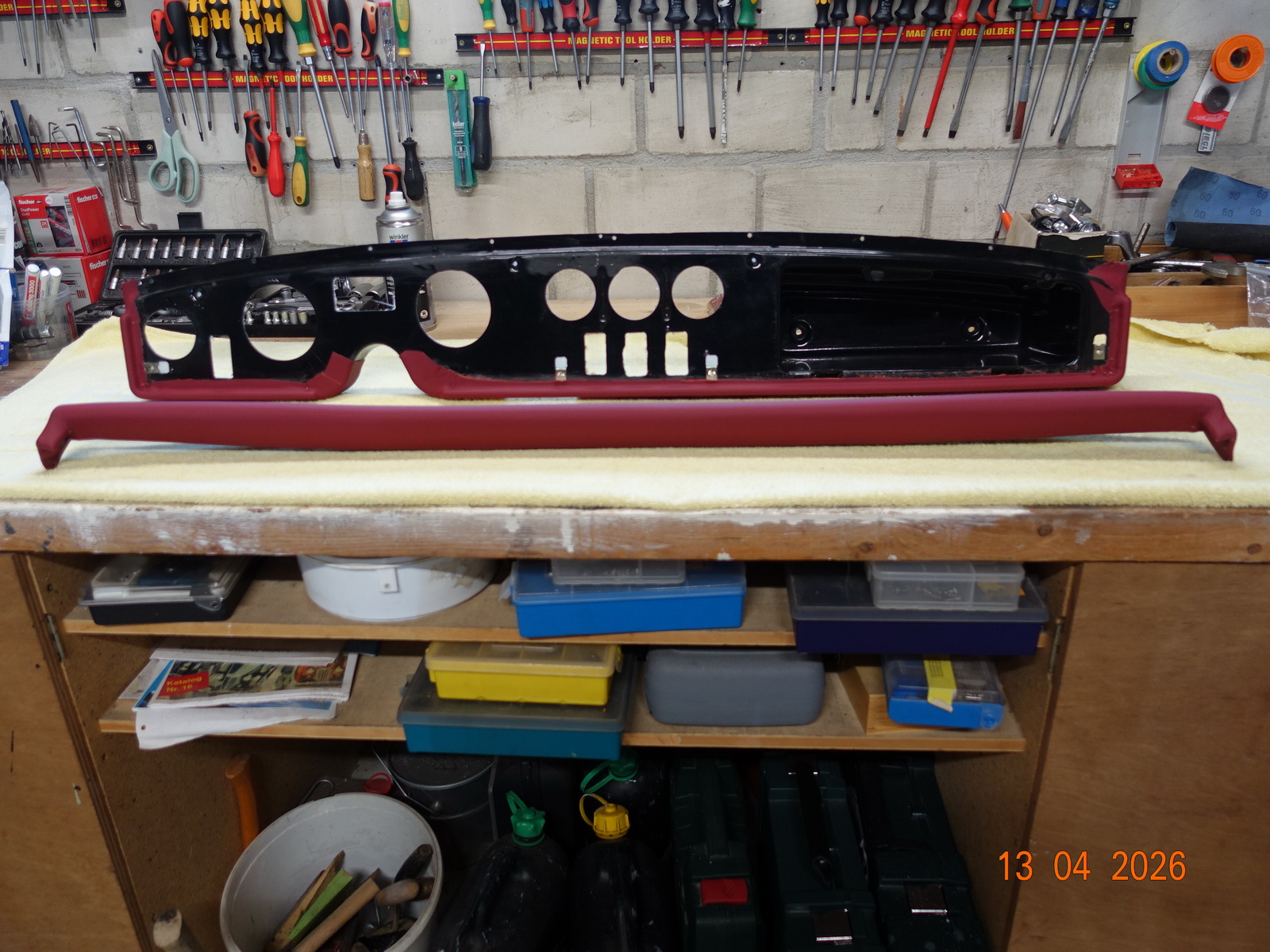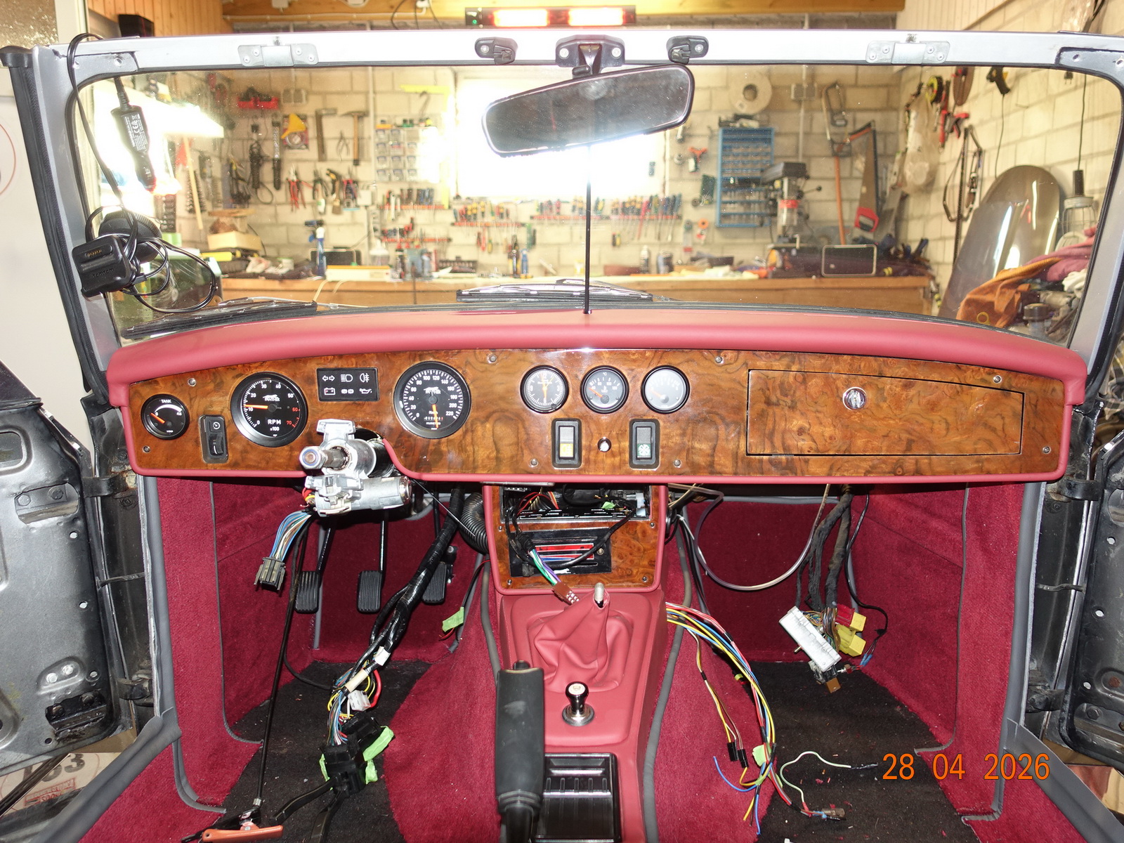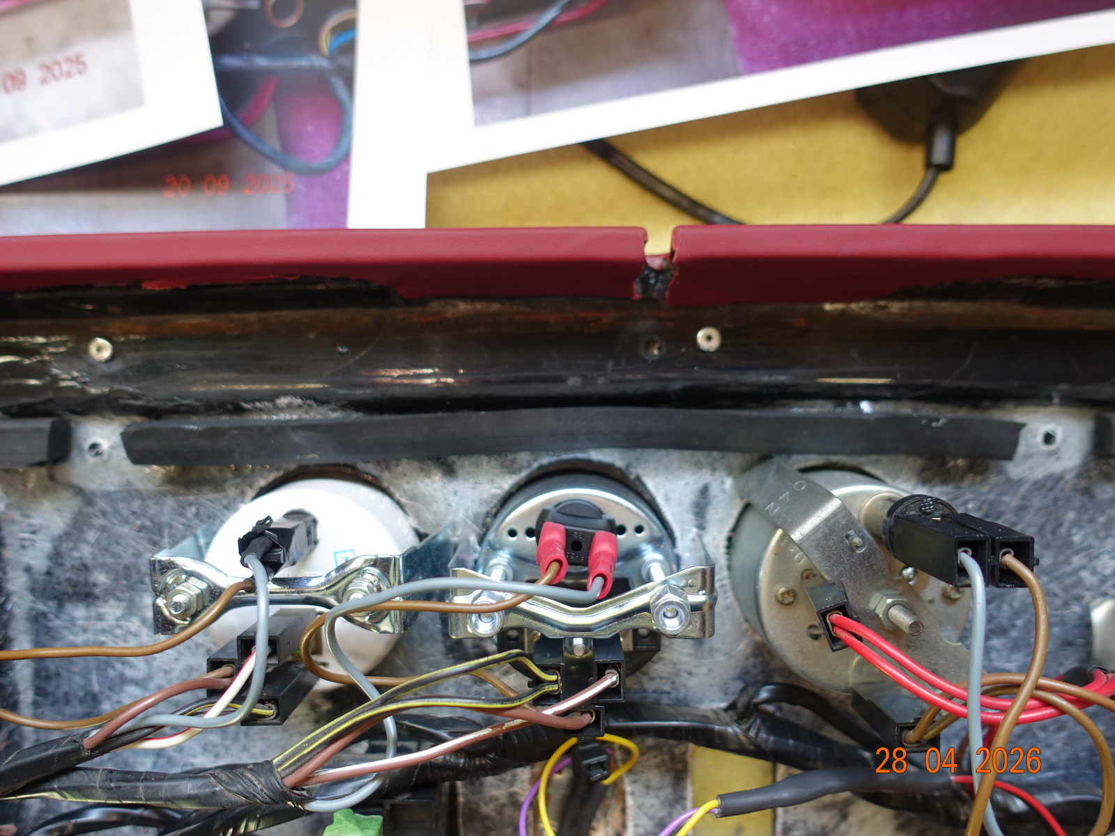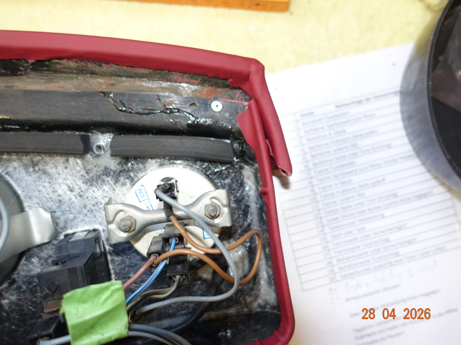Das Leder vom Armaturenbrett soll neu. Dazu muss es ausgebaut werden. Als die Schrauben ab waren, hing es an Kabel fest. Daraufhin haben wir das Blech im Motorraum demontiert.