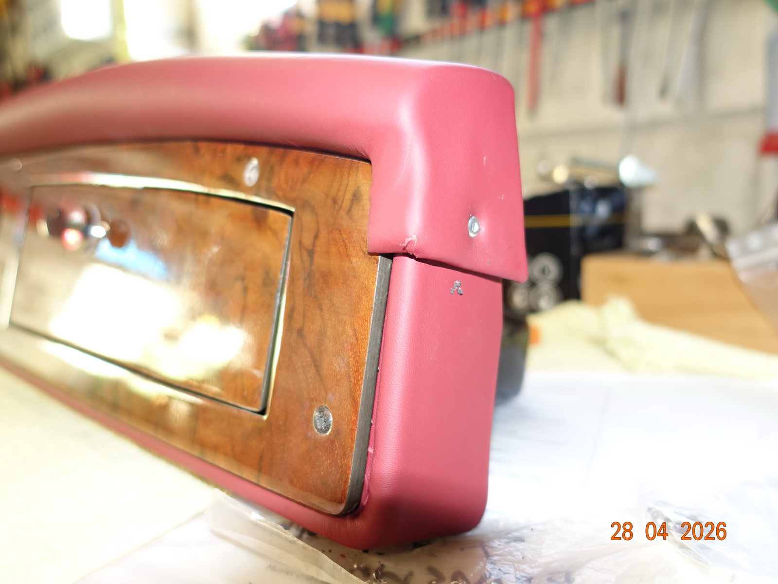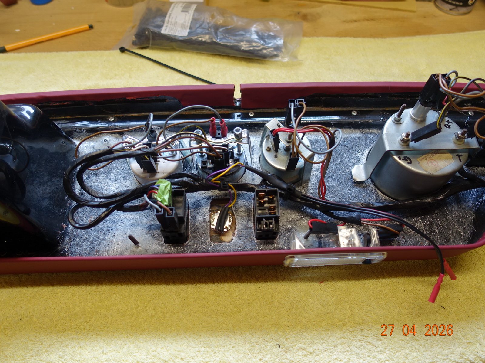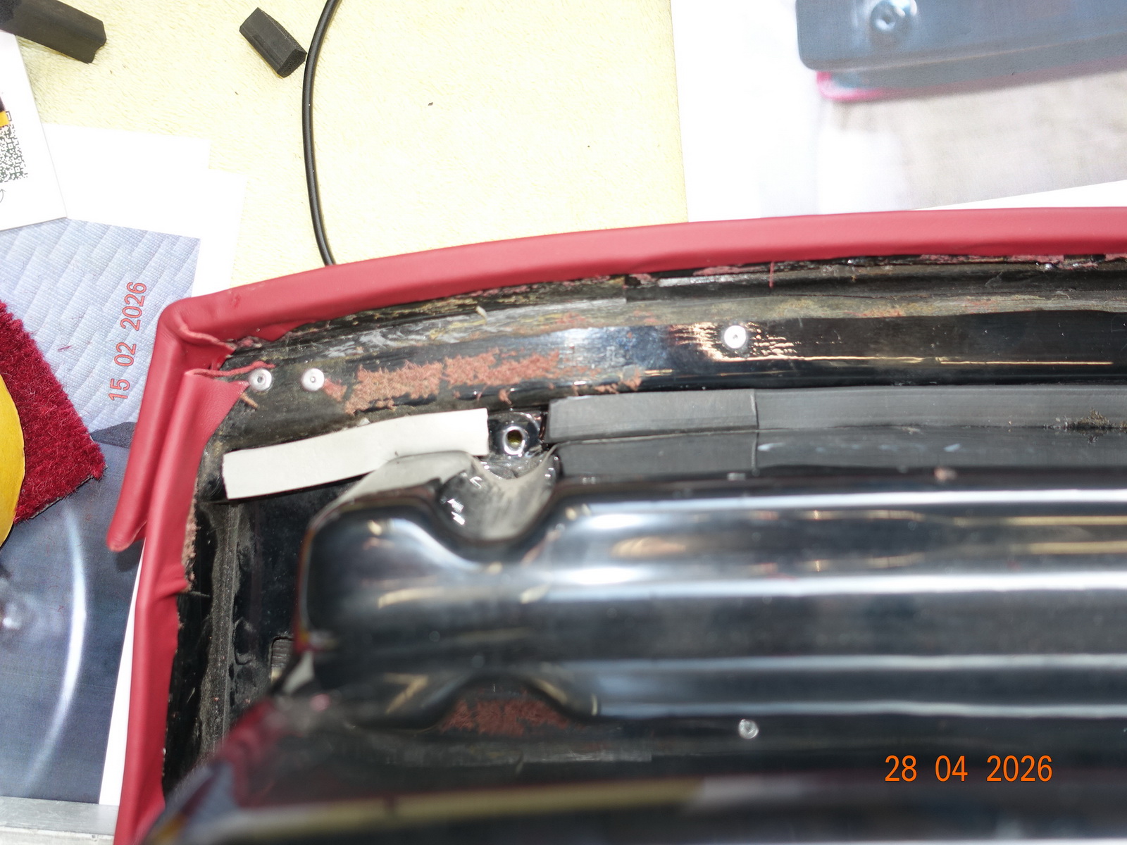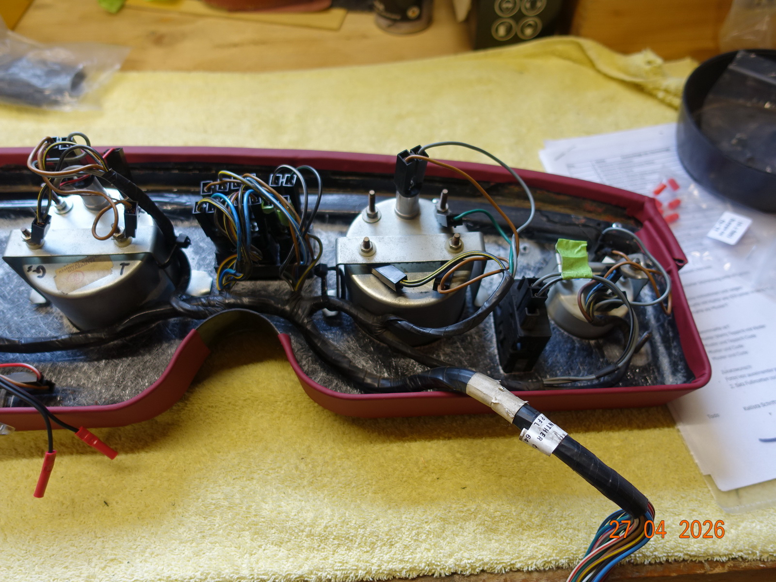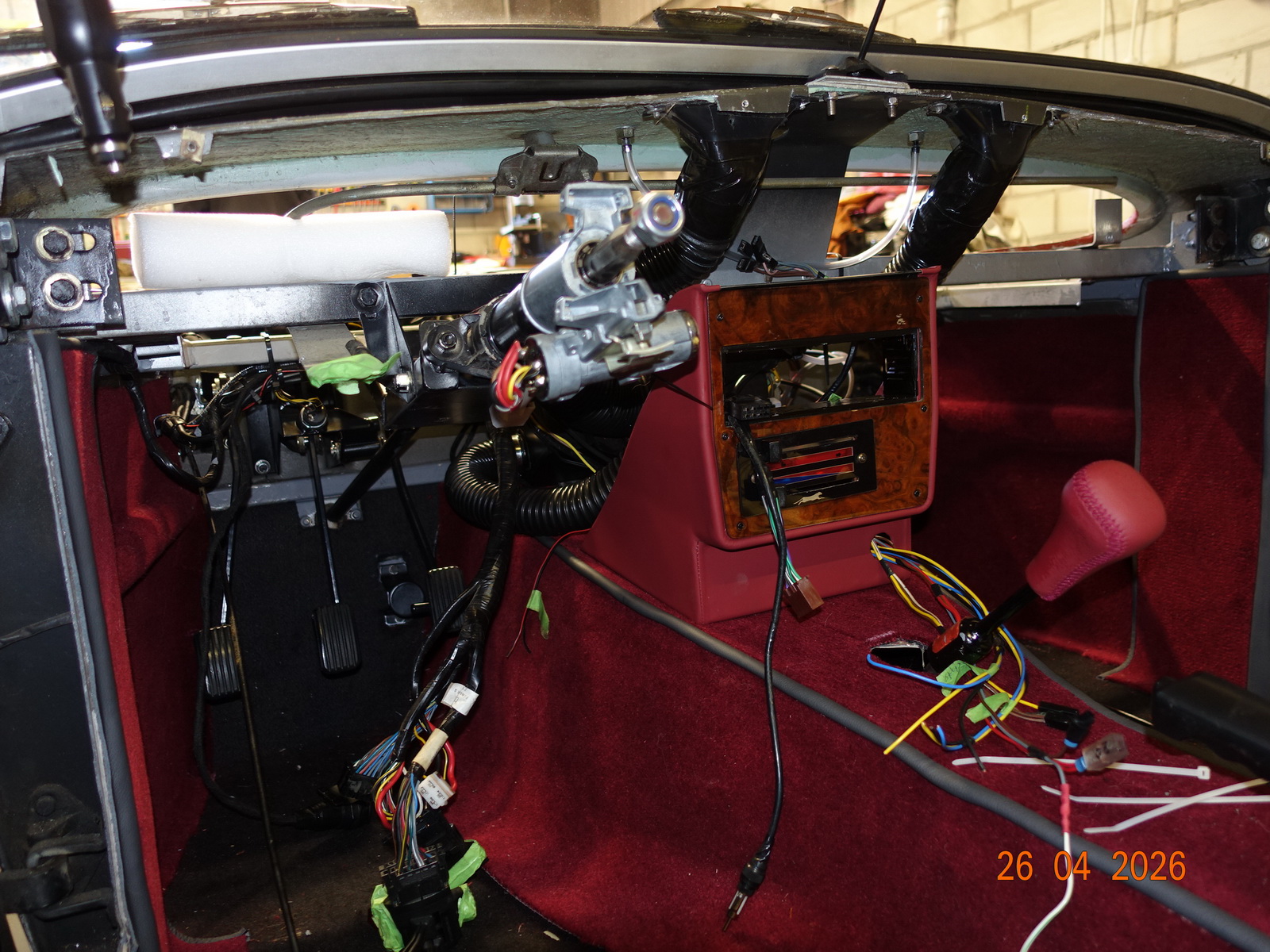 Das Leder vom Armaturenbrett soll neu. Dazu muss es ausgebaut werden. Als die Schrauben ab waren, hing es an Kabel fest. Daraufhin haben wir das Blech im Motorraum demontiert.