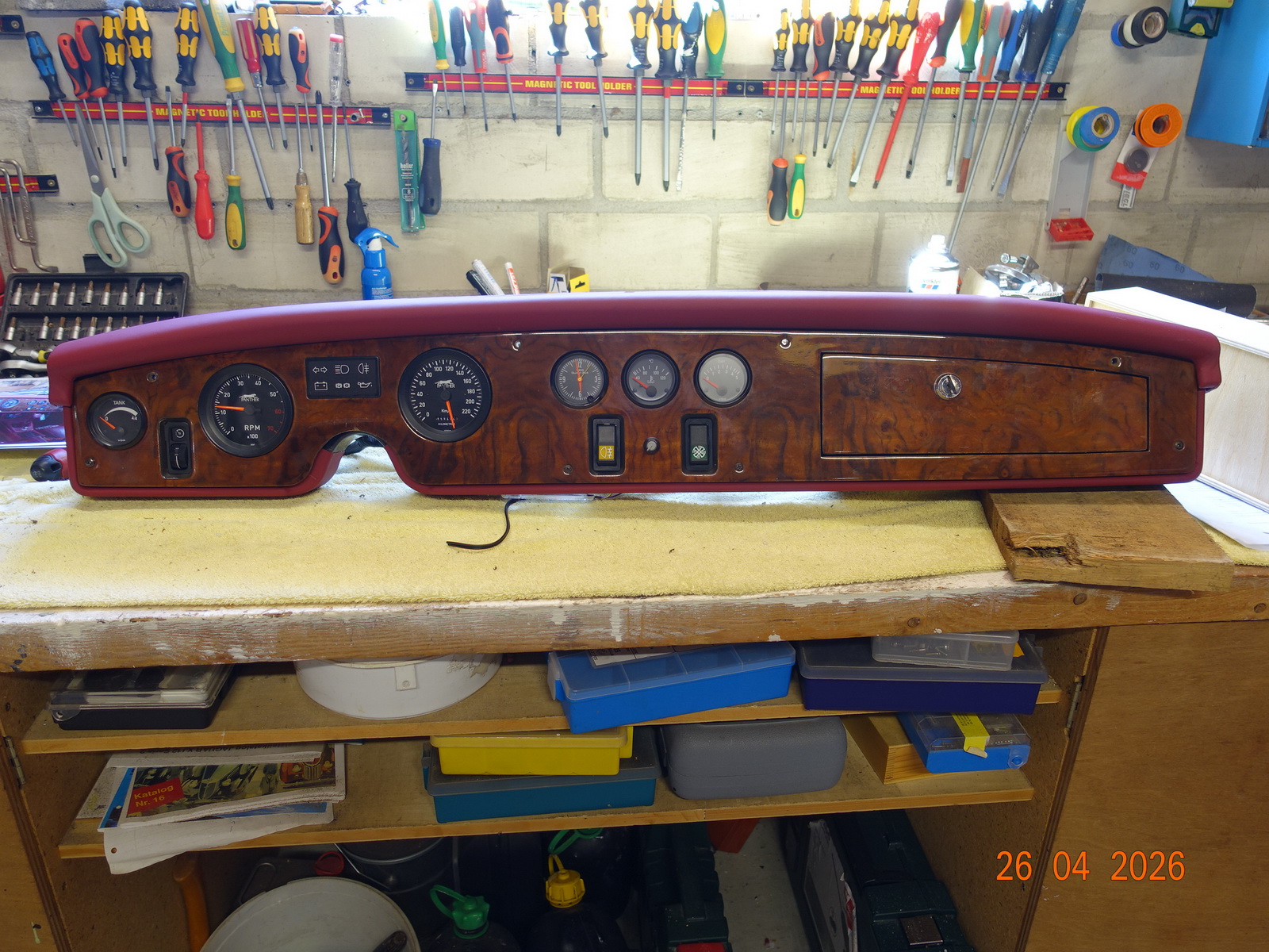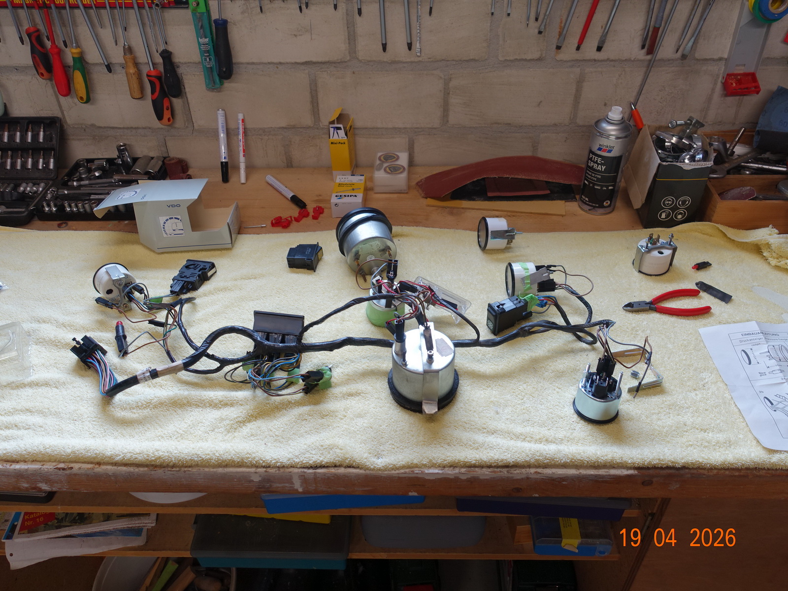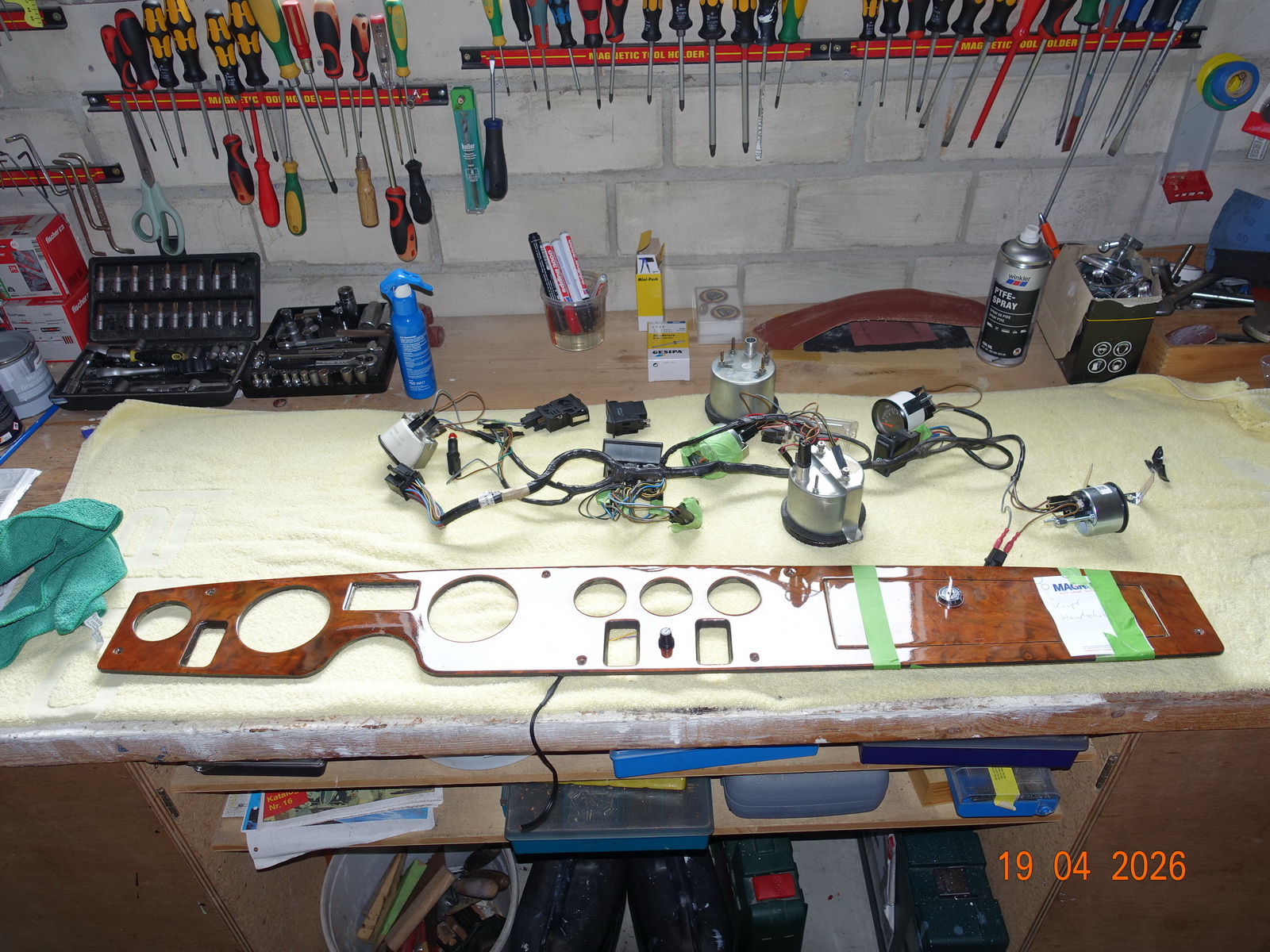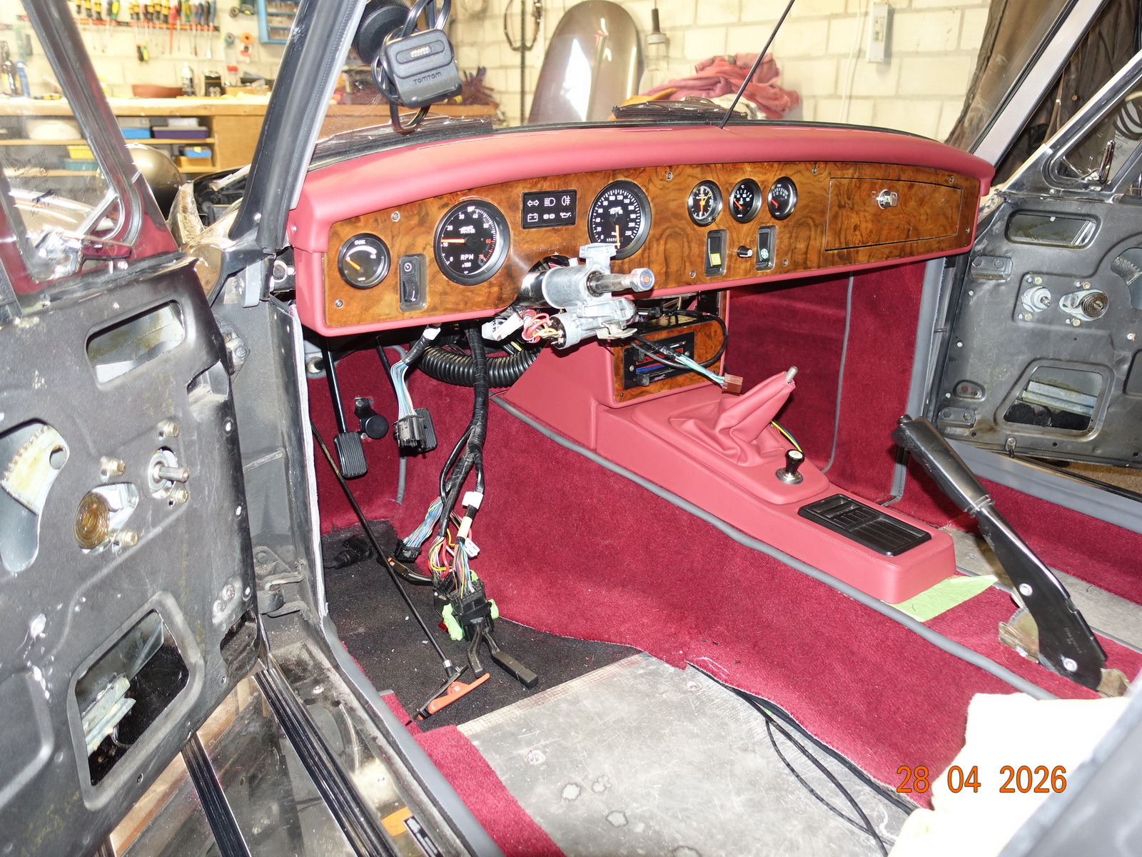 Das Leder vom Armaturenbrett soll neu. Dazu muss es ausgebaut werden. Als die Schrauben ab waren, hing es an Kabel fest. Daraufhin haben wir das Blech im Motorraum demontiert.