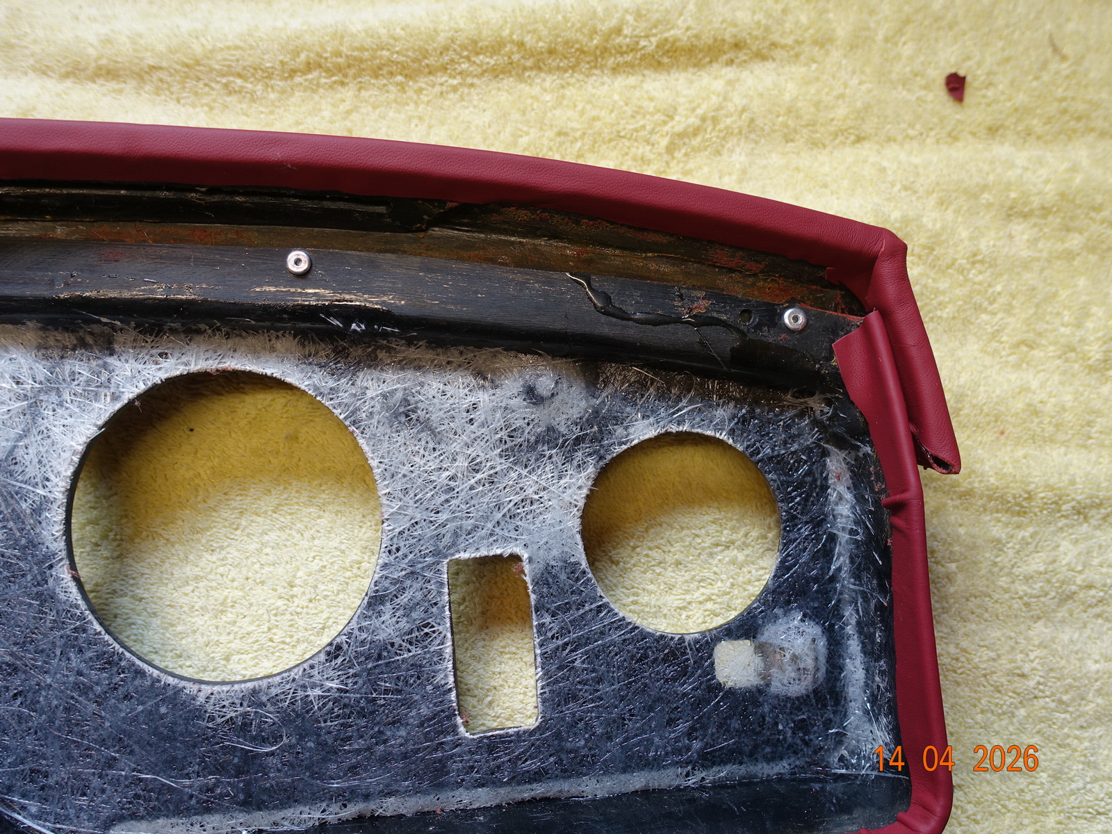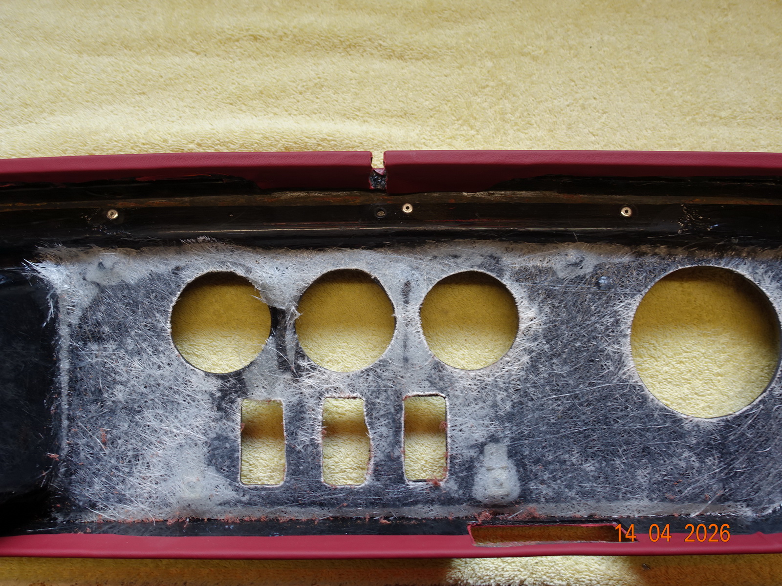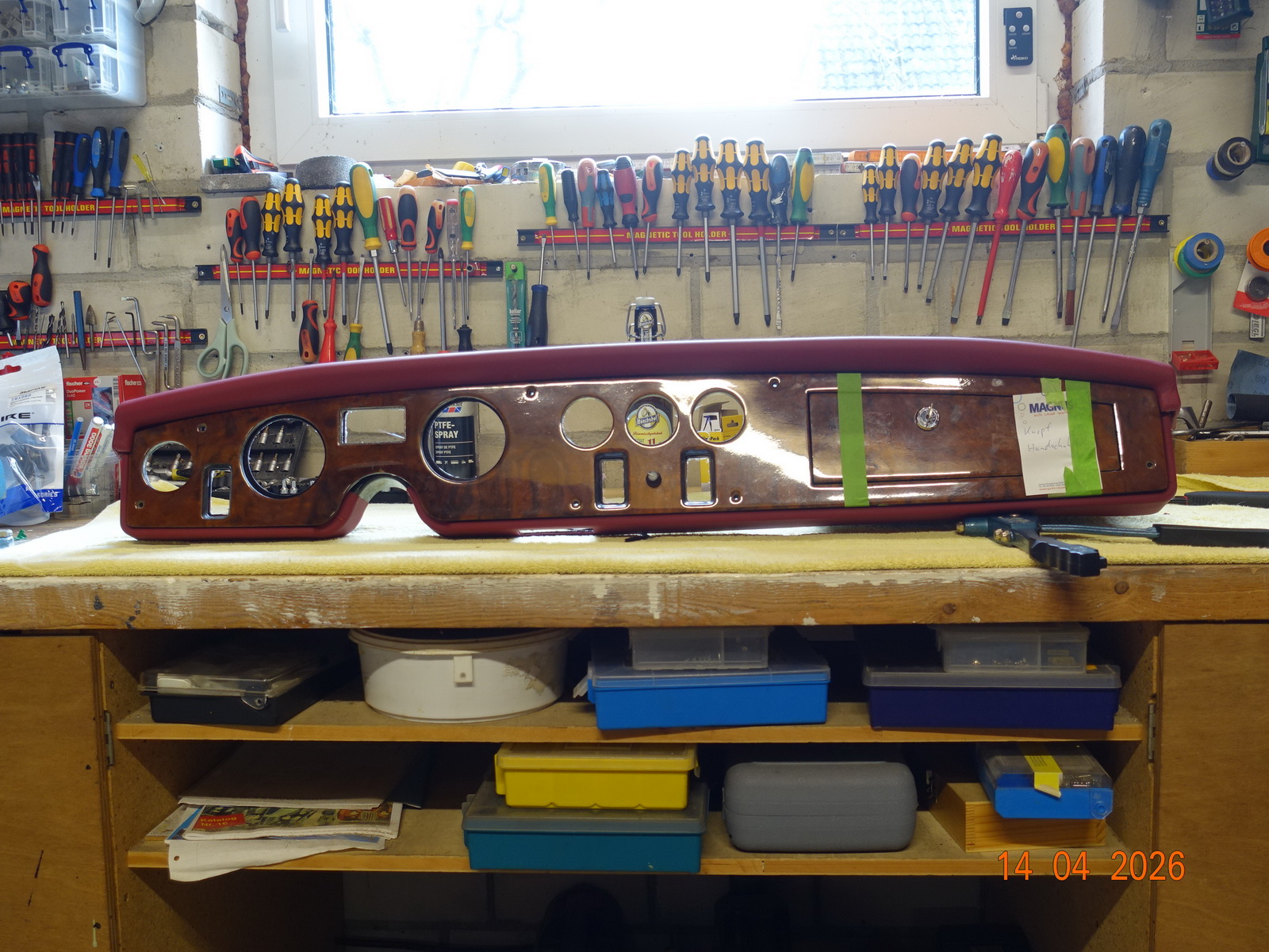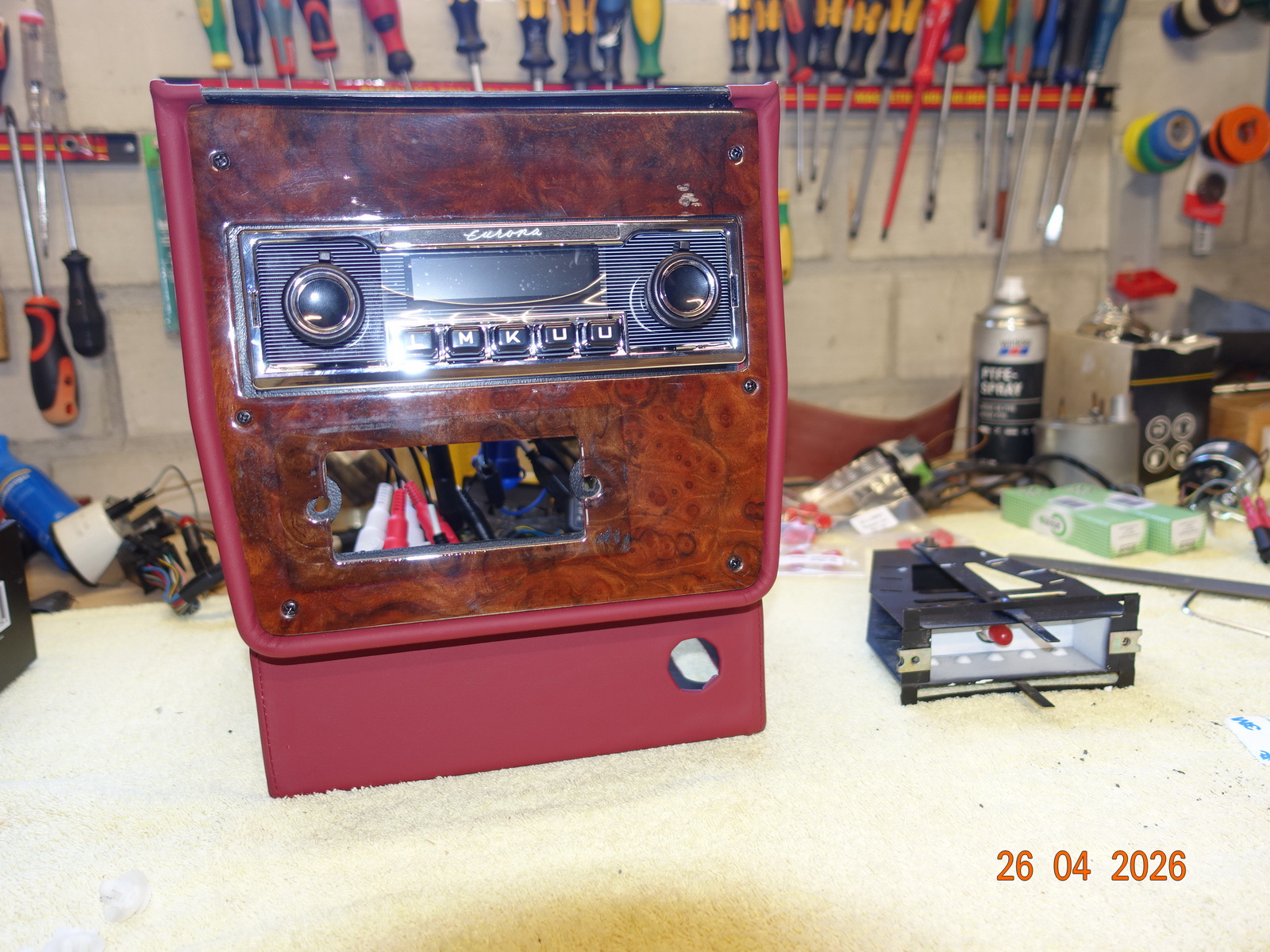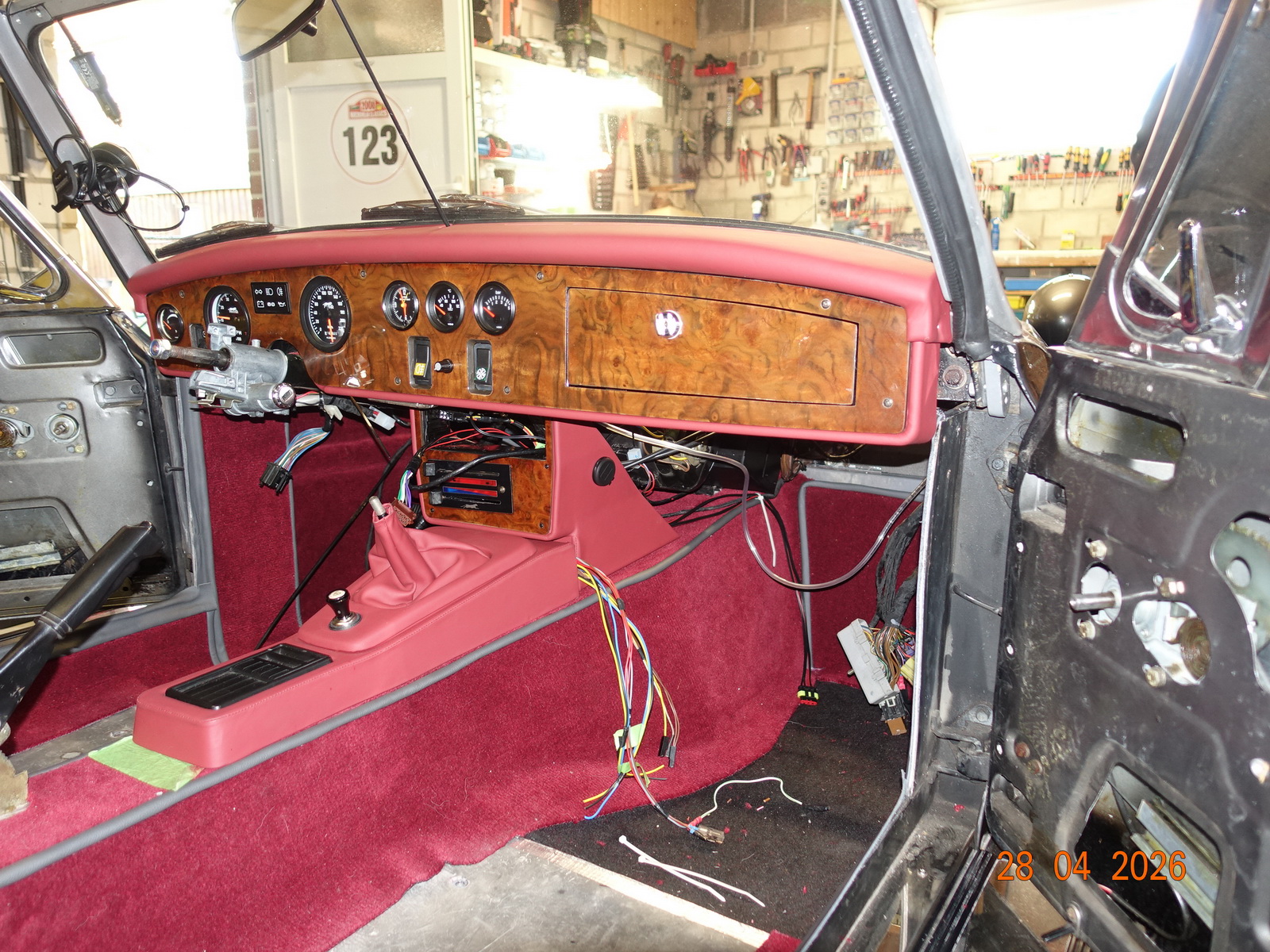 Das Leder vom Armaturenbrett soll neu. Dazu muss es ausgebaut werden. Als die Schrauben ab waren, hing es an Kabel fest. Daraufhin haben wir das Blech im Motorraum demontiert.