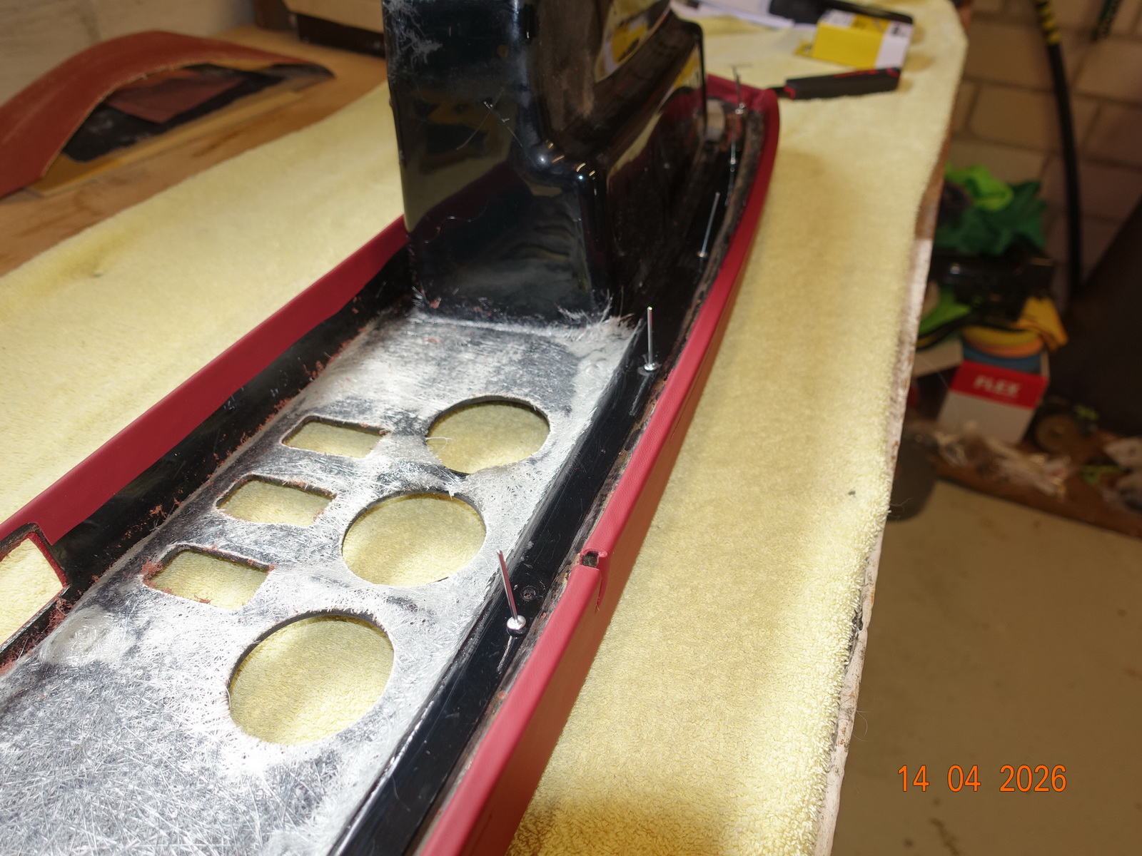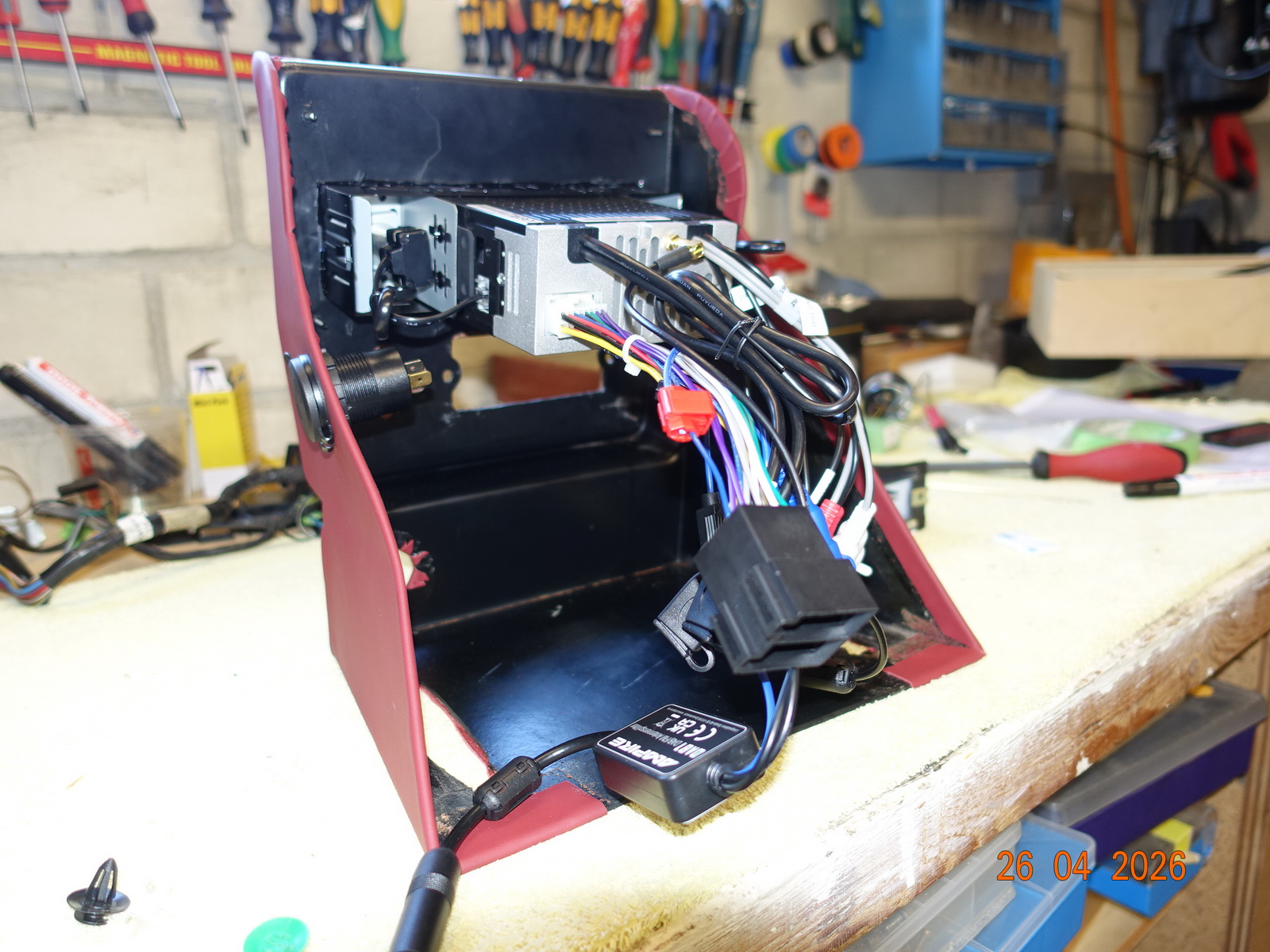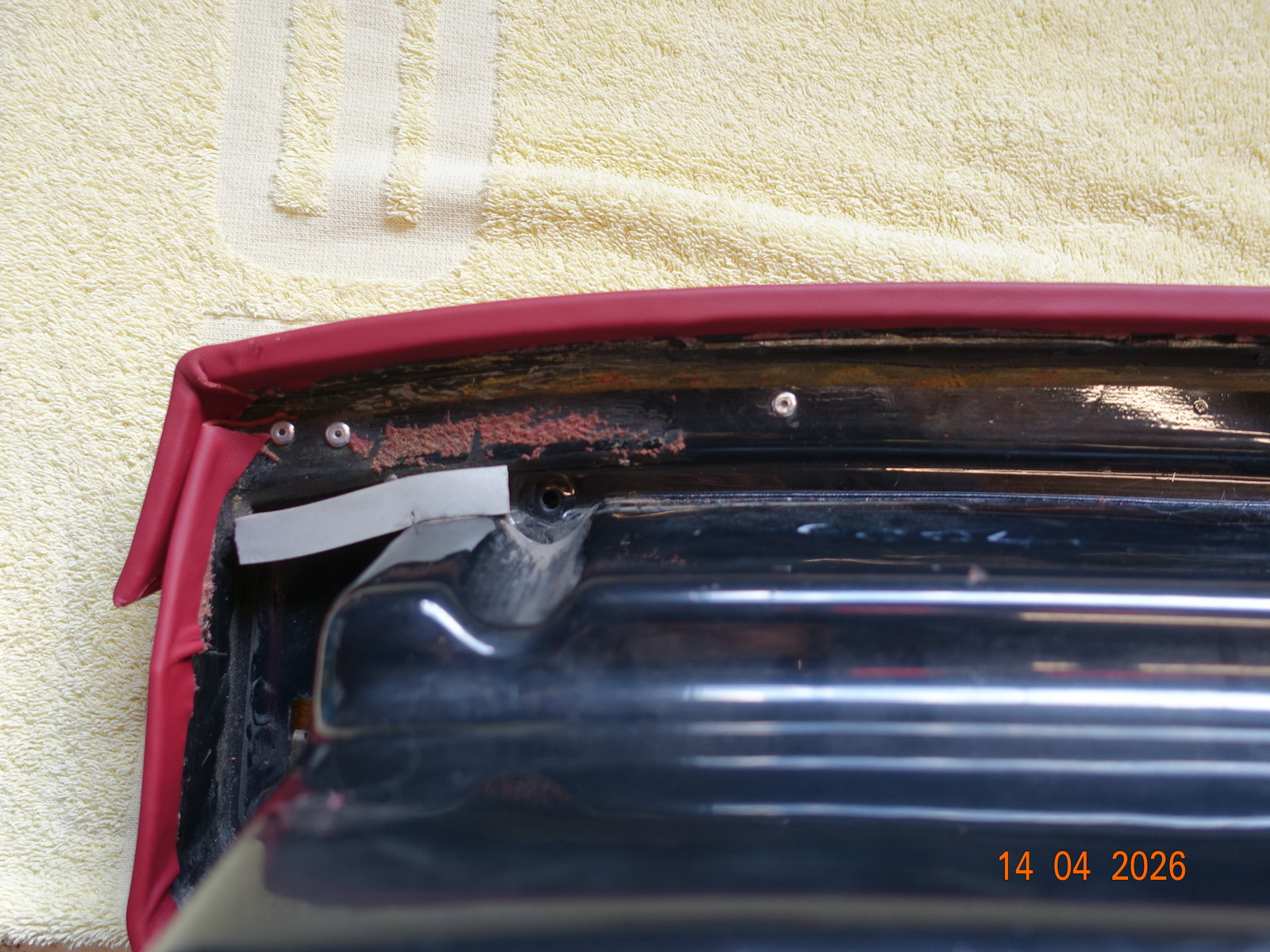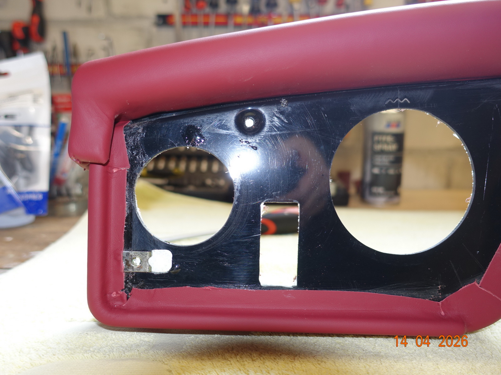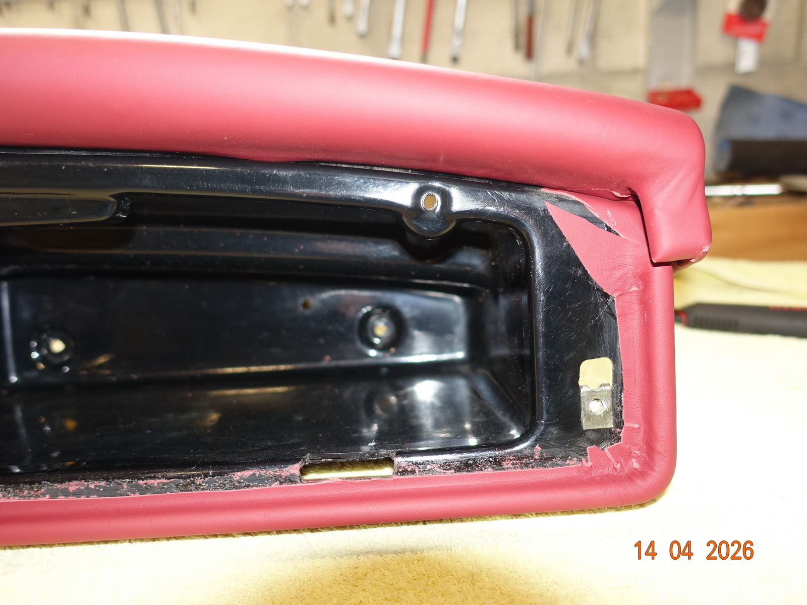 Das Leder vom Armaturenbrett soll neu. Dazu muss es ausgebaut werden. Als die Schrauben ab waren, hing es an Kabel fest. Daraufhin haben wir das Blech im Motorraum demontiert.