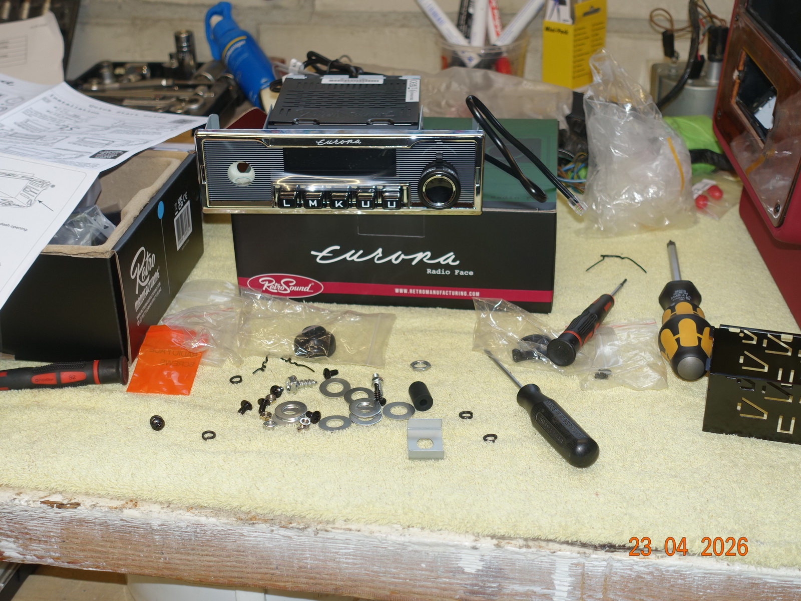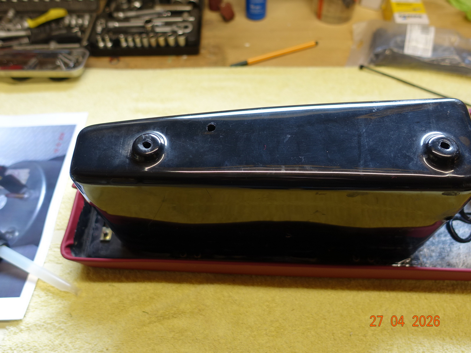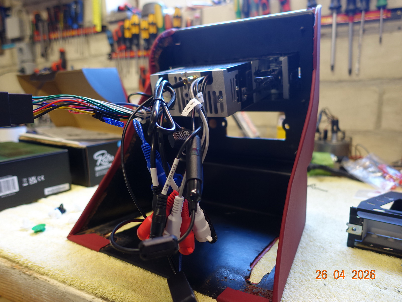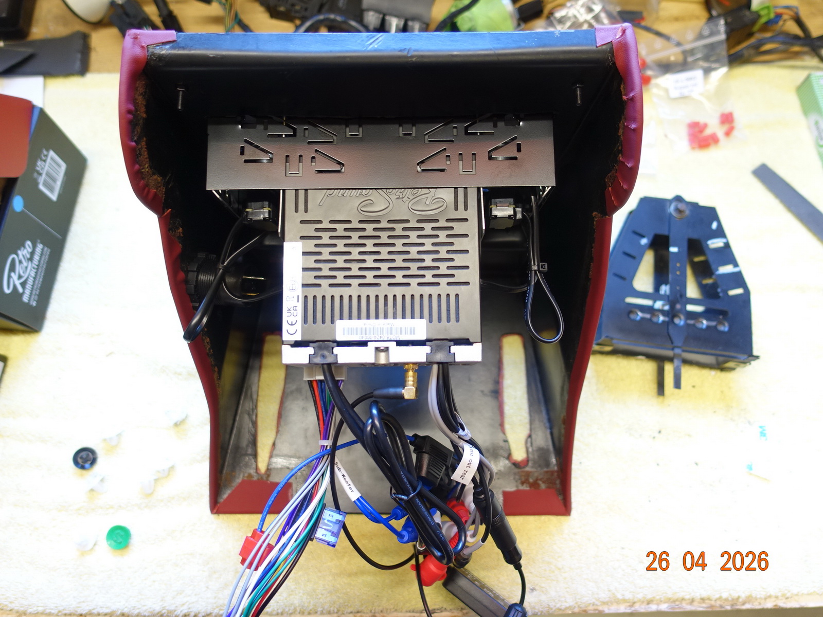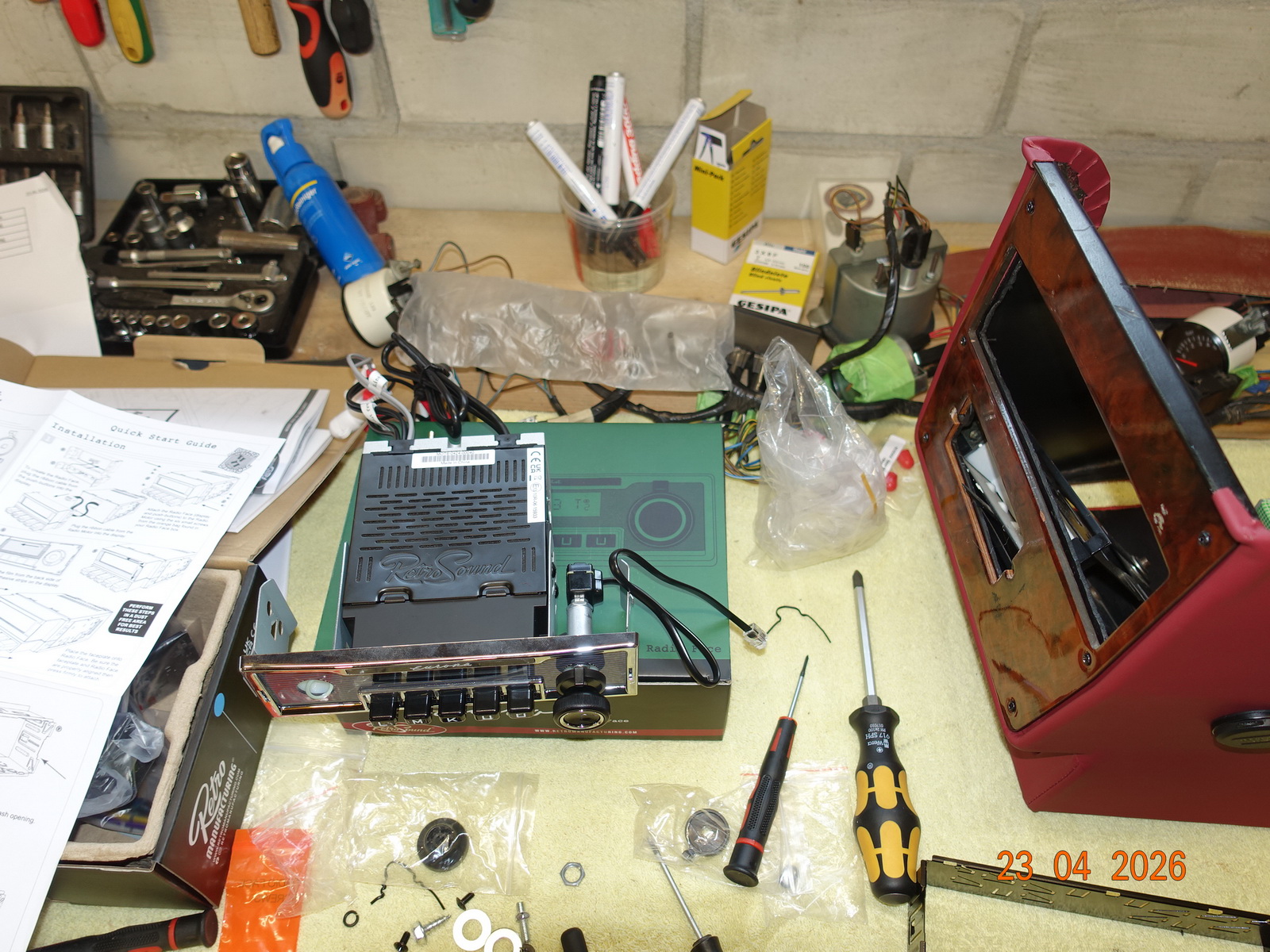 Das Leder vom Armaturenbrett soll neu. Dazu muss es ausgebaut werden. Als die Schrauben ab waren, hing es an Kabel fest. Daraufhin haben wir das Blech im Motorraum demontiert.