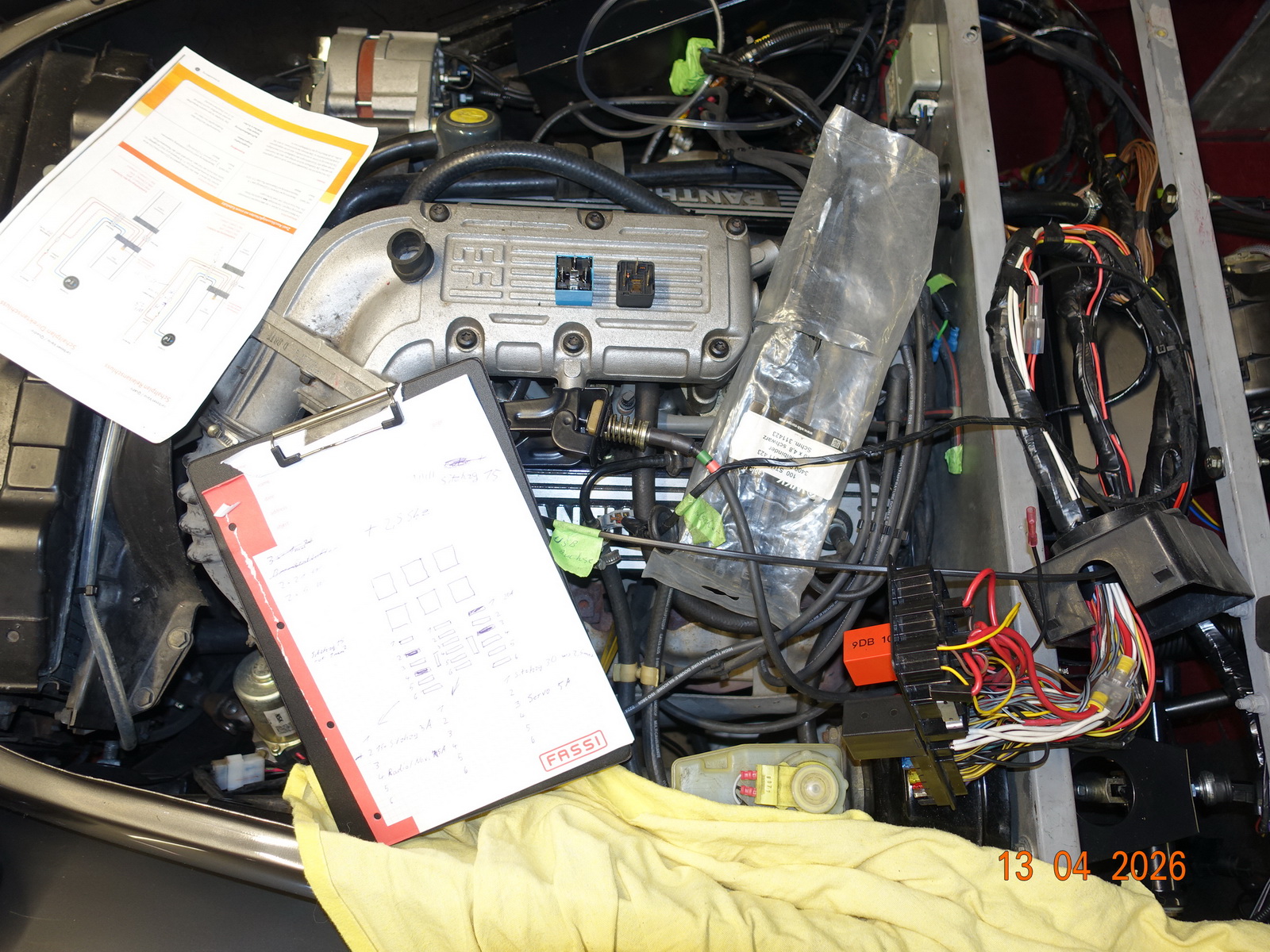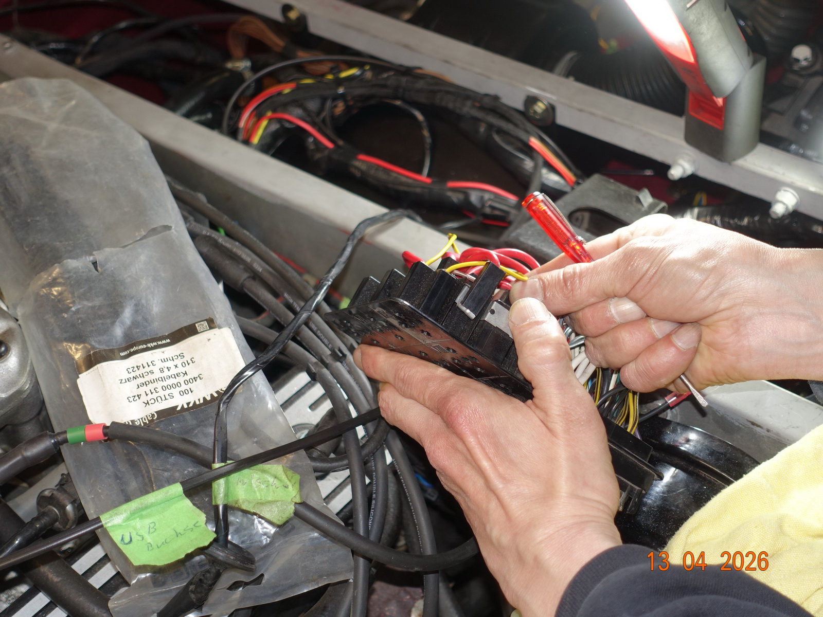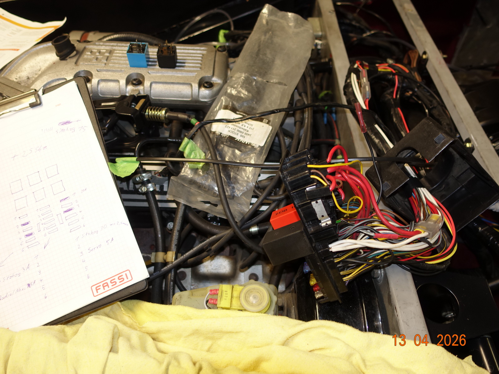 Da wir wegen dem Armaturenbrett das Blech um Motorraum demontiert hatten, war es die Gelegenheit den Bereich zu überholen. Alle raus, neue Kabel zum Sicherungskasten. Alle Kontakte überprüfen und ggf. löten.