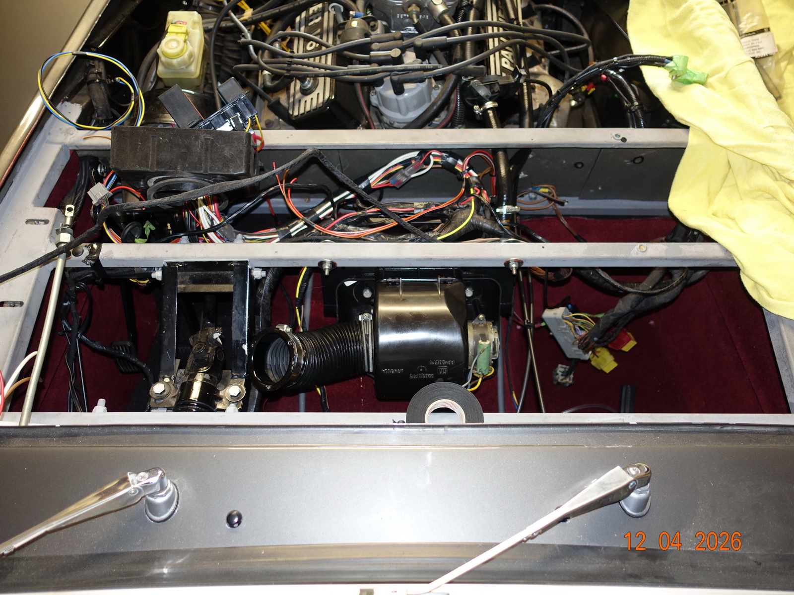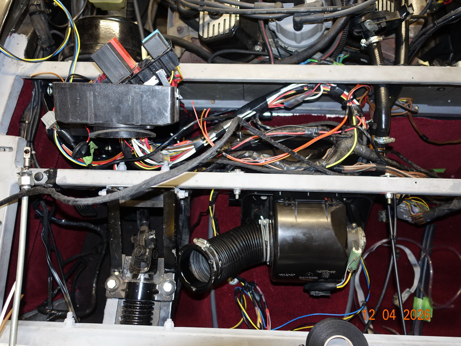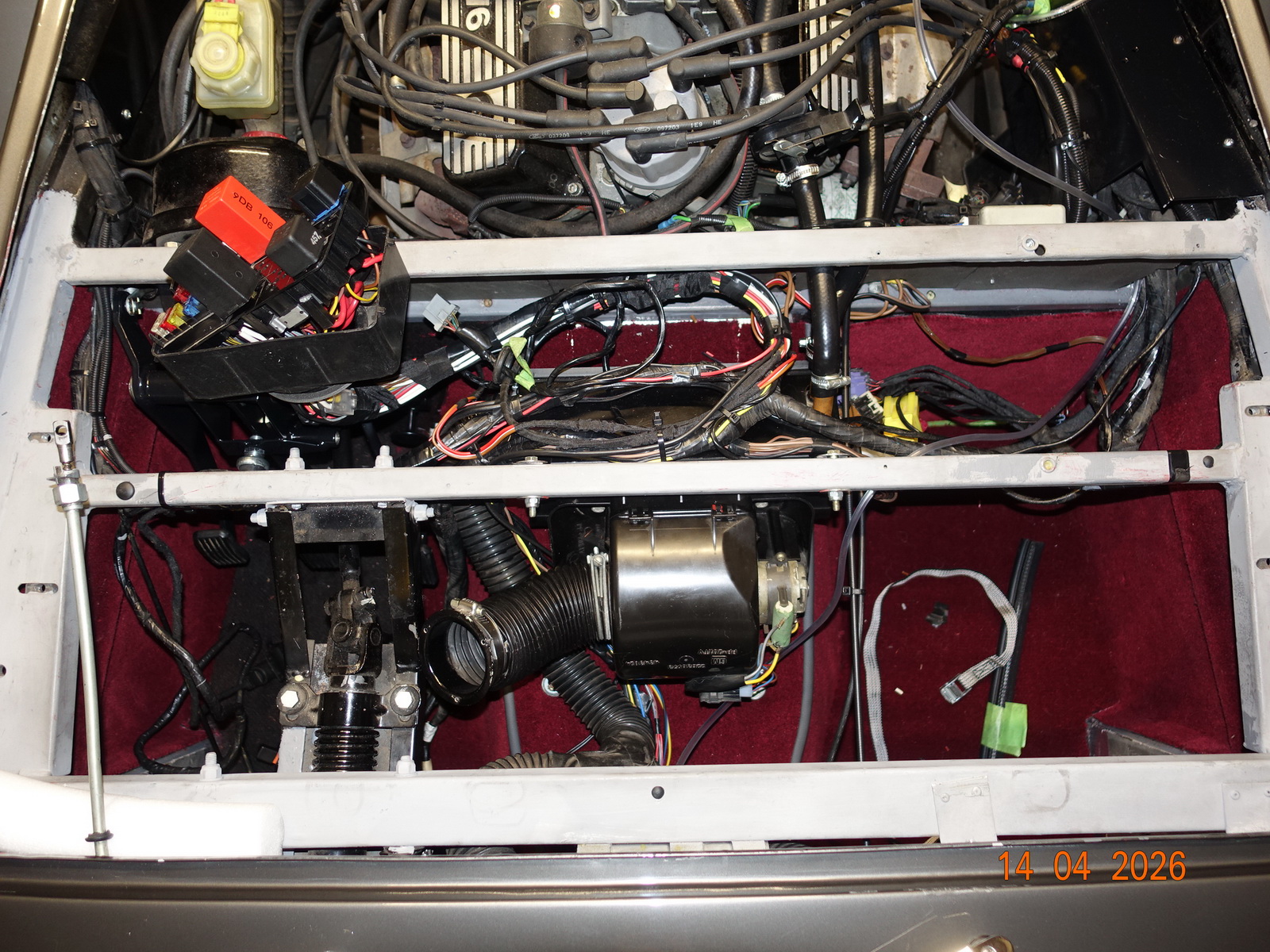 Since we had removed the sheet metal around the engine compartment for the dashboard, this was the opportunity to overhaul that area. We took everything out, installed new wires to the fuse box, and checked all the contacts and soldered them if necessary.